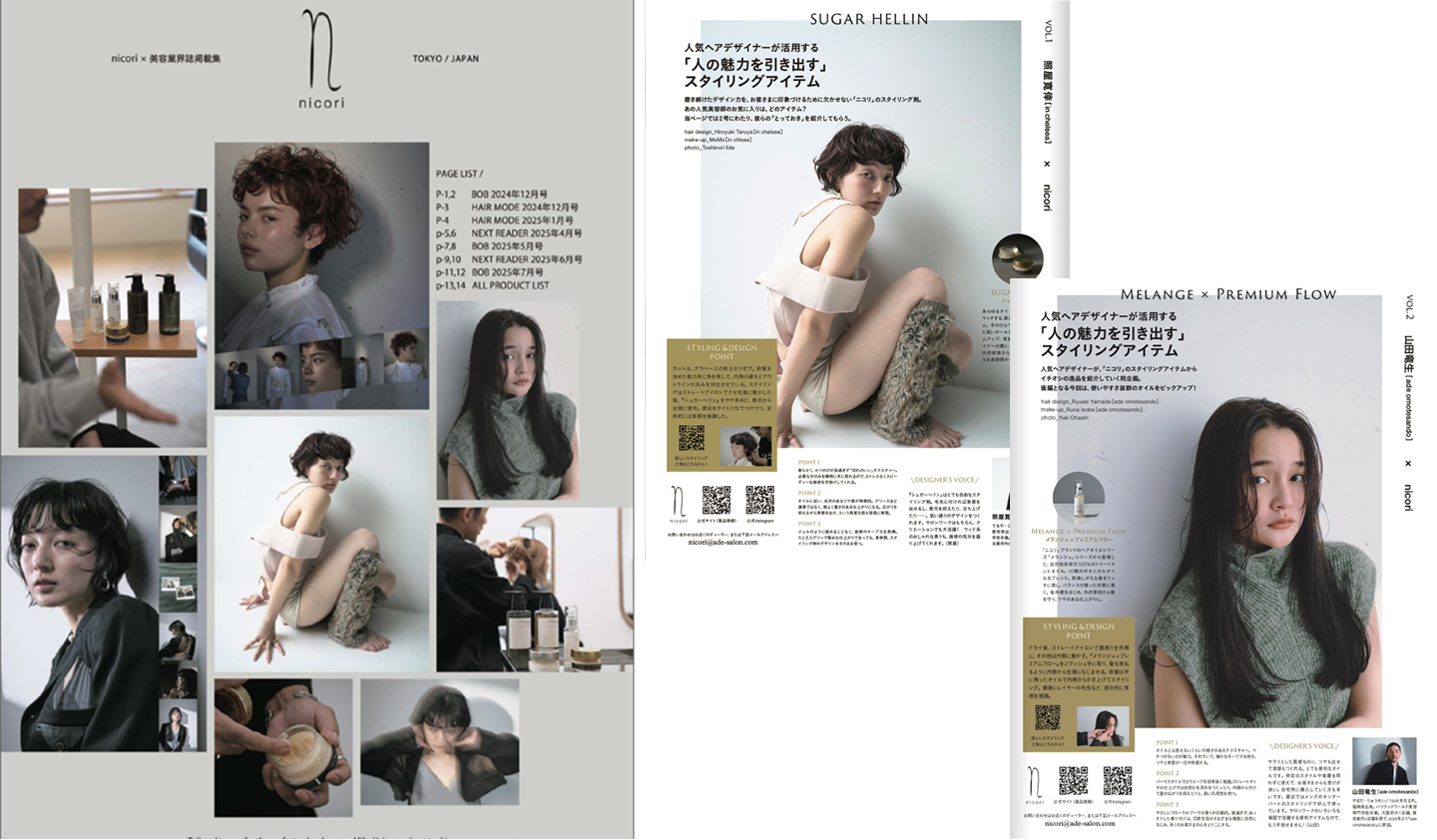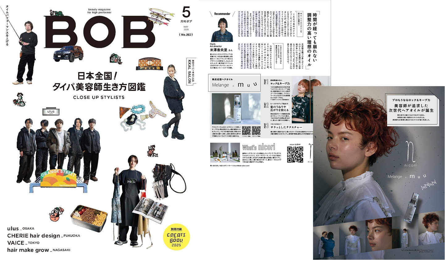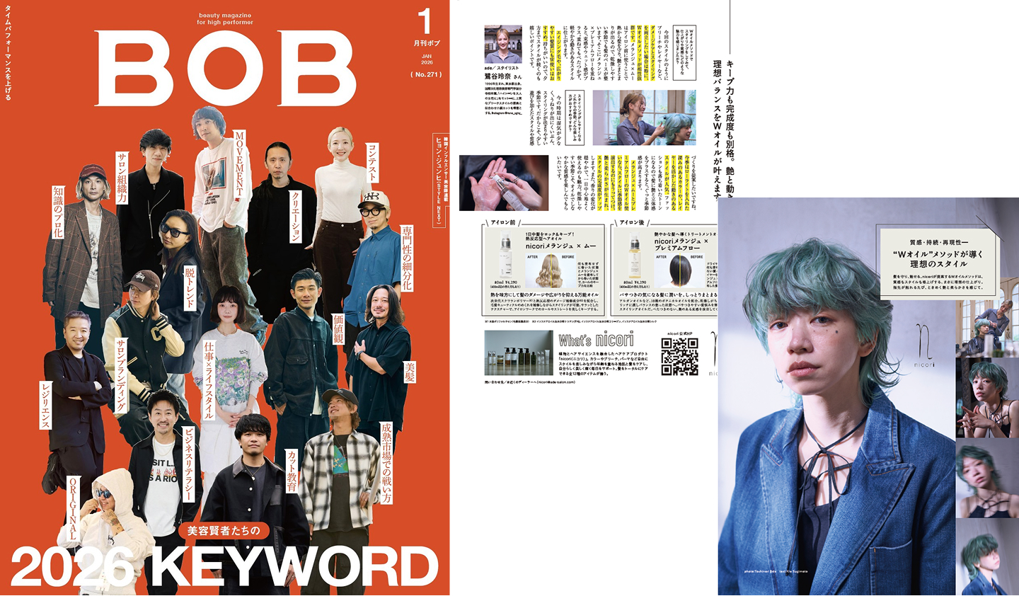 BOB2026年1月 nicori 掲載 〝Wオイル“メソッドが導く理想のスタイル 美容師向け雑誌『BOB』2026年1月号にて、nicoriが提案するWオイルメソッドによるオススメのスタイリングや使い方を紹介いただきました。