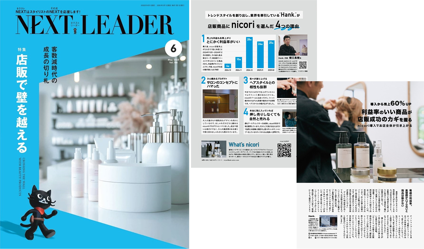 月刊 NEXTLEADER 6月号 nicori掲載 「利益率のいい商品が店販成功のカギを握る」 理美容経営者向け専門情報会員誌『月刊NEXT LEADER』6月号にて、トレンドスタイルを創り出し業界を牽引する Hank.代表 堀江昌樹氏に店販商品にni…
